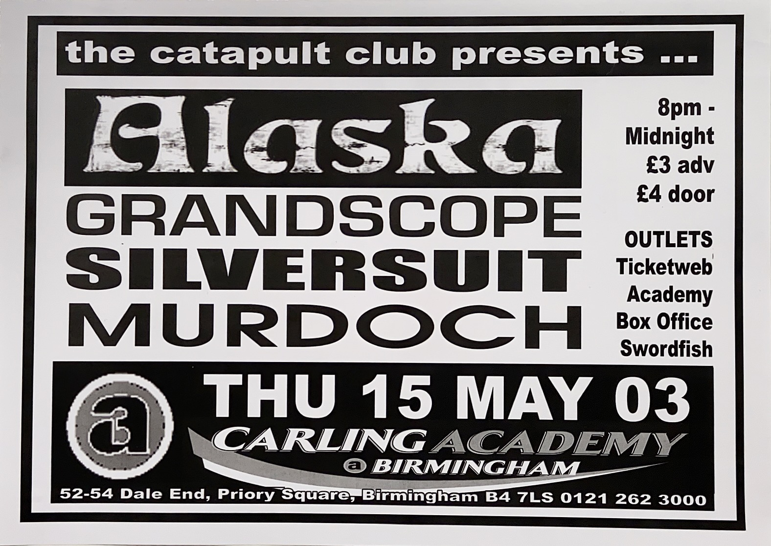 Flyer Alaska Grandscope Silversuit Murdoch Carling Academy Birmingham May 2003 Back to results Marc14 April 2026Arthur Tapp - Catapult Club flyer_15-05-2003_alaska_grandscope_silversuit_murdoch_carlingacademy_birmingham_arthurtapp Download TitleFlyer Alaska Grandscope Silversuit Murdoch Carling Academy Birmingham May 2003DescriptionCatapult Club presents Alaska live on stage at the Academy in Birmingham with Grandscope, Silversuit and Murdoch in support on 15th May 2003.Band/Performer/EventAlaska | Grandscope | Murdoch | SilversuitDate15 May 2003VenueThe Carling AcademyGenreRockSourceArthur Tapp - Catapult Club Share this item Previous itemFlyer Buick 6 Burnside Carlo Jug of Ale Birmingham Next itemFlyer The Two Man Band Jug of Ale Birmingham