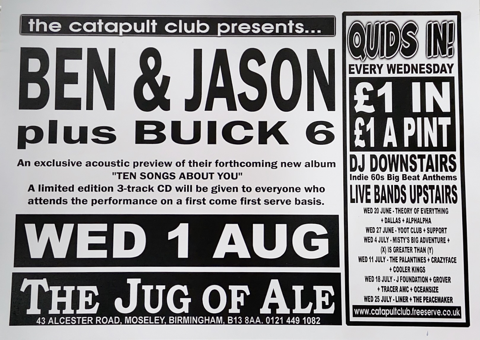 Flyer Ben and Jason Buick 6 Jug of Ale Birmingham Back to results Marc13 April 2026Arthur Tapp - Catapult Club flyer_01-08_benandjason_jugofale_birmingham_arthurtapp Download TitleFlyer Ben and Jason Buick 6 Jug of Ale BirminghamDescriptionCatapult Club presents Ben & Jason with support from Buick 6 live at the Jug of Ale Moseley. An exclusive acoustic preview of their new album 'Ten Songs About You'Band/Performer/EventBen and Jason | Buick 6VenueThe Jug of Ale - MoseleyGenreRockSourceArthur Tapp - Catapult Club Share this item Previous itemFlyer Second Sun Rising Moog Grand Union Jug of Ale Birmingham Next itemFlyer 360 Katlama Codeine Jug of Ale Birmingham