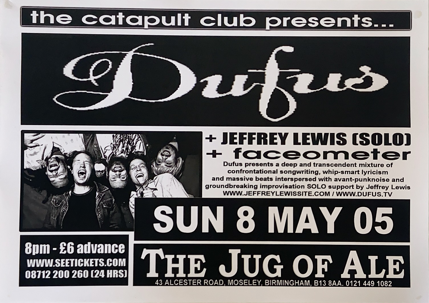 Flyer Dufus Jeffrey Lewis Faceometer Jug of Ale Birmingham May 2005 Back to results Marc13 April 2026Arthur Tapp - Catapult Club flyer_08-05_dufus_jugofale_birmingham_arthurtapp Download TitleFlyer Dufus Jeffrey Lewis Faceometer Jug of Ale Birmingham May 2005DescriptionThe Catapult Club presents Dufus at the Jug of Ale in Moseley with Jeffrey Lewis (solo) and Faceometer in support on 8th May 2005Band/Performer/EventDufus | Faceometer | Jeffrey Lewis (solo)Date8 May 2005VenueThe Jug of Ale - MoseleyGenreRockSourceArthur Tapp - Catapult Club Share this item Previous itemFlyer The Dears Silversuit The Will to Rally Jug of Ale Birmingham Next itemFlyer Pan Bagman Jug of Ale Birmingham
