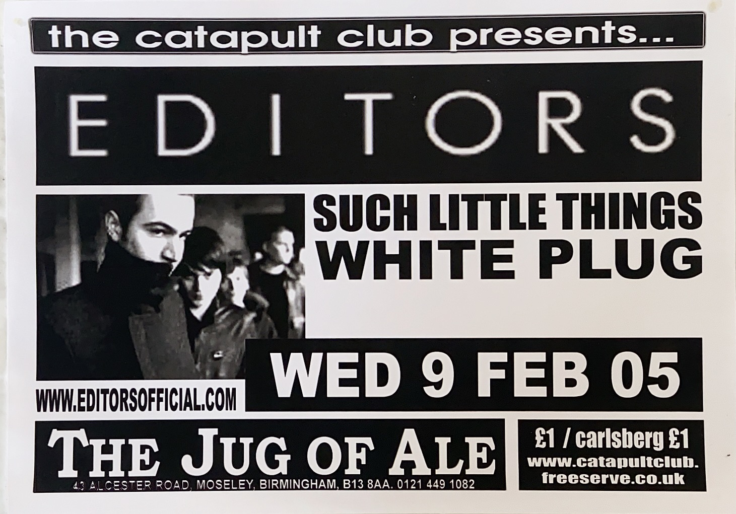 Flyer Editors Such Little Things White Plug Jug of Ale Birmingham Feb 2005 Back to results Marc13 April 2026Arthur Tapp - Catapult Club flyer_09-02-2005_editors_jugofale_birmingham_arthurtapp Download TitleFlyer Editors Such Little Things White Plug Jug of Ale Birmingham Feb 2005DescriptionThe Catapult Club presents Editors live in concert at one of their first gigs in the City with Such Little Things and White Plug in support on 9th February 2005.Band/Performer/EventEditors | Such Little Things | White PlugVenueThe Jug of Ale - MoseleyGenreRockSourceArthur Tapp - Catapult Club Share this item Previous itemFlyer Old School Tie Bar Academy Birmingham December 2007 Next itemFlyer Stereogram Sunstone Jackpot Jug of Ale Birmingham
