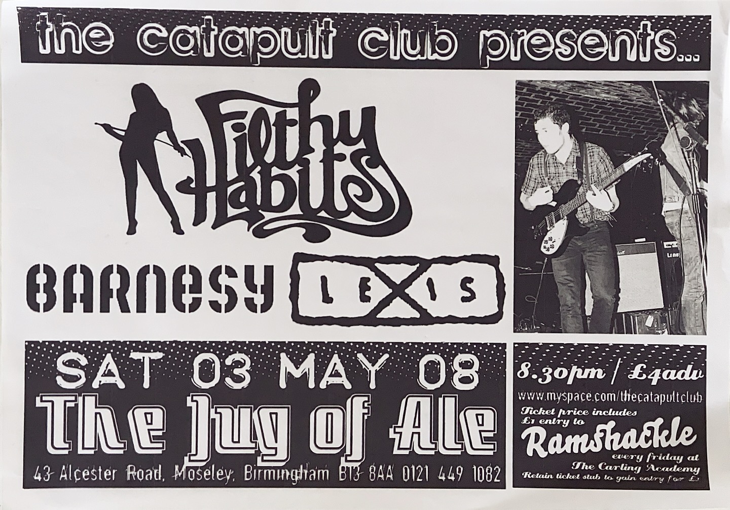 Flyer – Filthy Habits Barnesy Lexis Jug of Ale Birmingham May 2008 Back to results Marc13 April 2026Arthur Tapp - Catapult Club flyer_03-05-2008_filthyhabits_jugofale_birmingham_arthurtapp Download TitleFlyer - Filthy Habits Barnesy Lexis Jug of Ale Birmingham May 2008DescriptionThe Catapult Club Presents Filthy Habits, Barnesy and Lexis live at The Jug of Ale in Moseley Birmingham on 3rd May 2008Band/Performer/EventBarnesy | Filthy Habits | LexisDate3 May 2008VenueThe Jug of Ale - MoseleyGenreRockSourceArthur Tapp - Catapult Club Share this item Previous itemFlyer Escobar Mayday Hero Machine Jug of Ale Birmingham Next itemFlyer Cooler Than Jesus Exposure Rock Cafe Birmingham