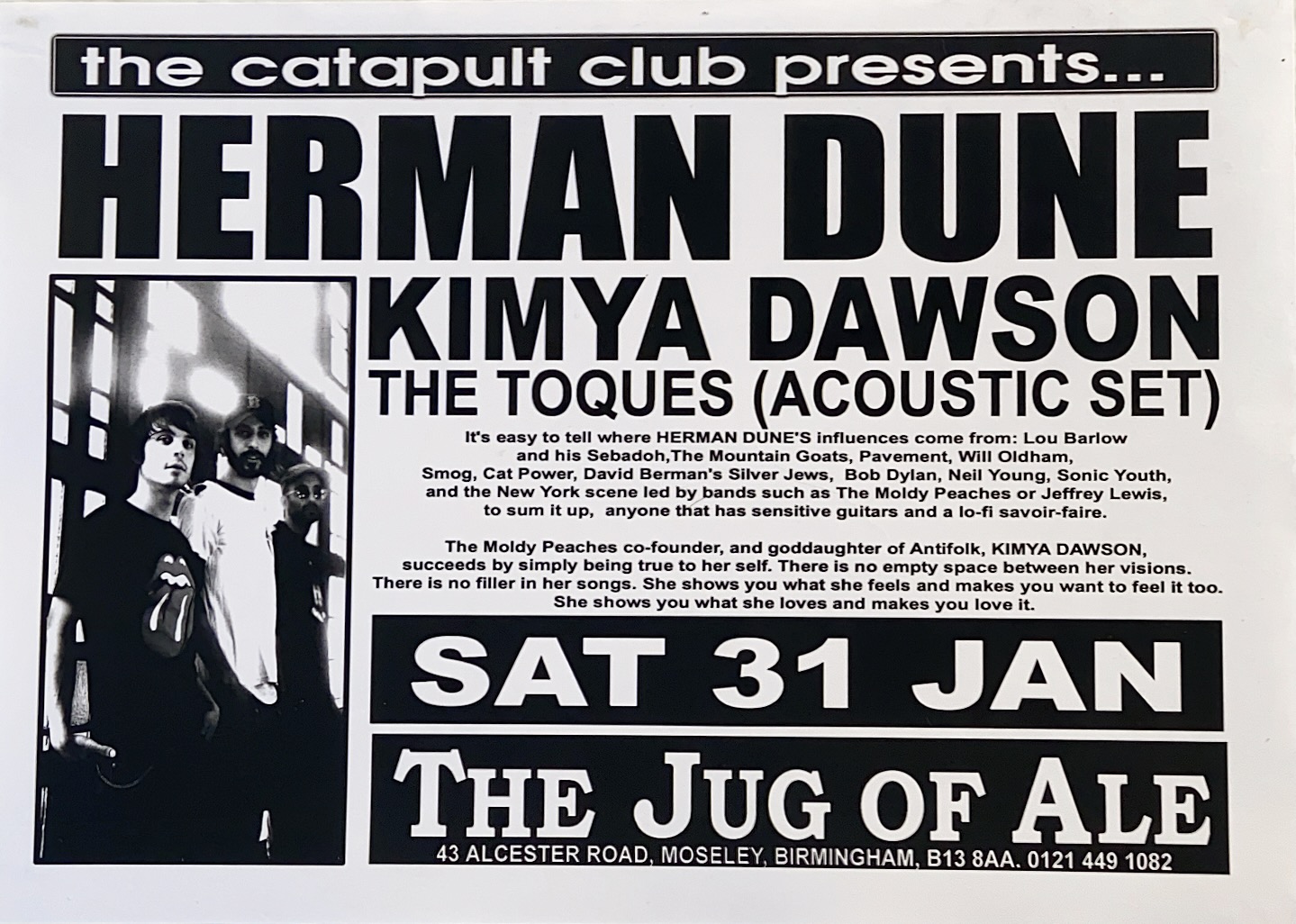 Flyer Herman Dune Kimya Dawson Jug of Ale Birmingham Back to results Marc14 April 2026Arthur Tapp - Catapult Club flyer_31-01_hermandune_jugofale_birmingham_arthurtapp Download TitleFlyer Herman Dune Kimya Dawson Jug of Ale BirminghamDescriptionPresented by The Catapult Club, flyer for Herman Dune on stage at The Jug of Ale Moseley with Kimya Dawson of the Toques performing an acoustic set.Band/Performer/EventHerman Dune | Kimya DawsonVenueThe Jug of Ale - MoseleyGenreRockSourceArthur Tapp - Catapult Club Share this item Previous itemFlyer Xposure Rock Cafe Birmingham Next itemFlyer The Others Agent Blue The Paddingtons Jug of Ale Birmingham