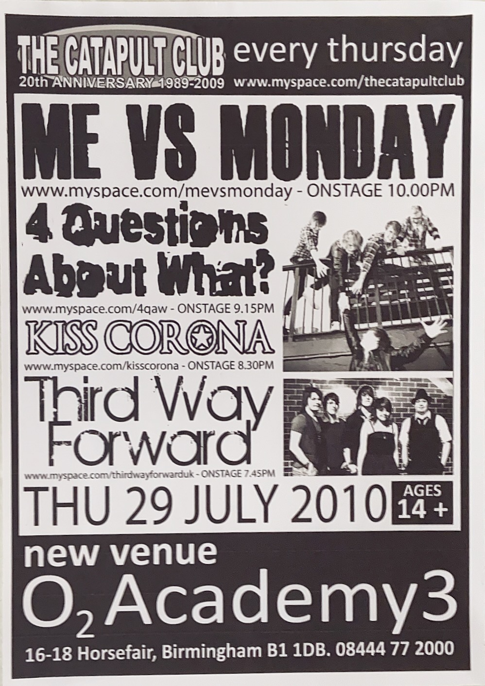Flyer Me vs Monday o2 Academy 3 Birmingham July 2010 Back to results Marc14 April 2026Arthur Tapp - Catapult Club flyer_29-07-2010_mevsmonday_o2academy3_birmingham_arthurtapp Download TitleFlyer Me vs Monday o2 Academy 3 Birmingham July 2010DescriptionPresented by The Catapult Club Me vs Monday live on stage at Birmingham Academy 3 on 29th July 2010 with 4 Questions about What? Kiss Corona and Third Way Forward in support.Band/Performer/Event4 Questions About What | Kiss Corona | Me vs Monday | Third Way ForwardDate29 July 2010VenueAcademy 3 BirminghamGenreRockSourceArthur Tapp - Catapult Club Share this item Previous itemFlyer Judi Owen Patria Keenan Liberty Thieves Grogan and Spoz PSV Out of the Blue Hare and Hounds Birmingham Next itemFlyer Rise Every Friday with Third Floor Calm Bar Academy Birmingham Jan 2005
