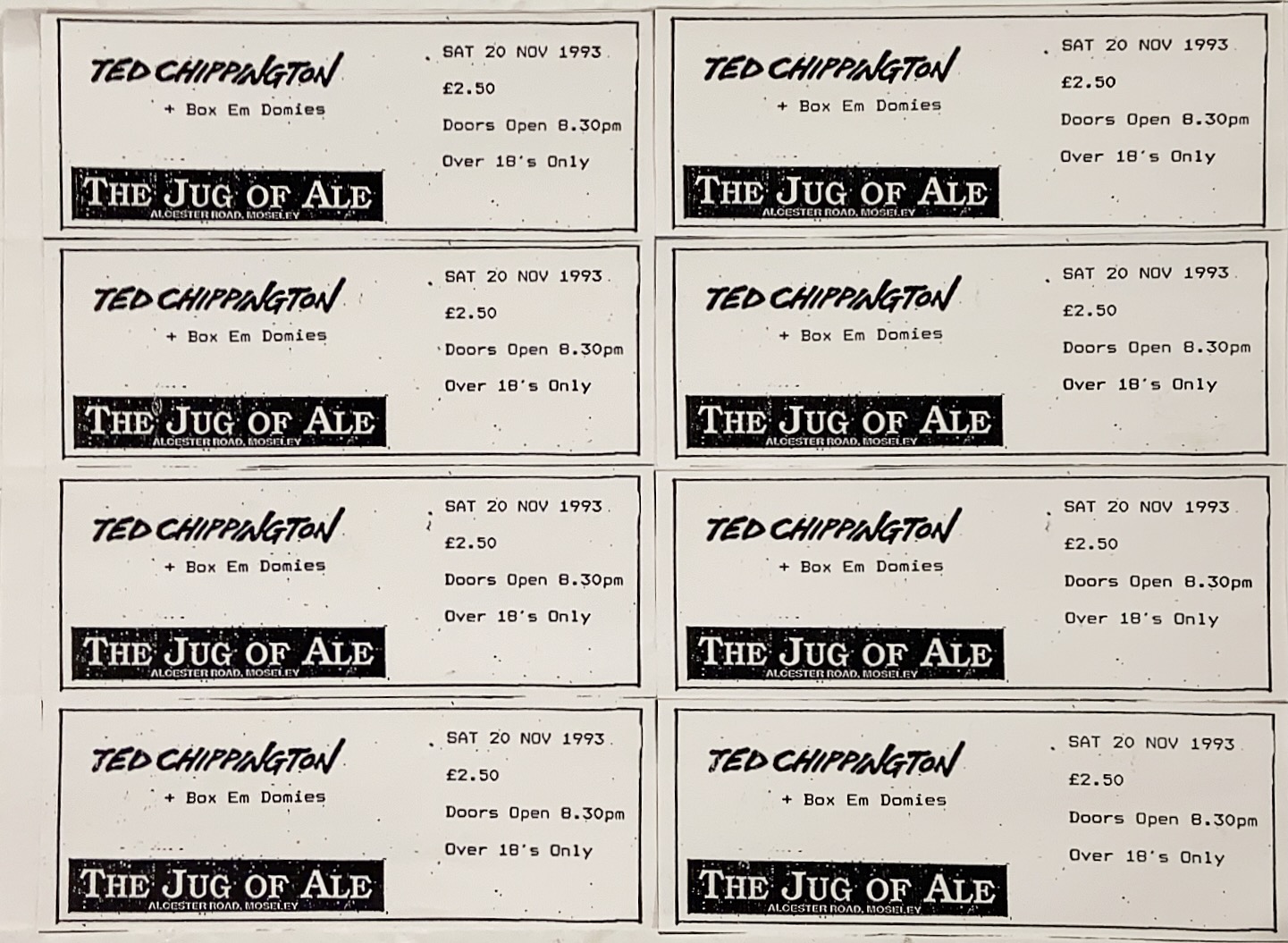 Flyer Ted Chippington Box em Domies Jug of Ale Birmingham November 1993 Back to results Marc14 April 2026Arthur Tapp - Catapult Club flyer_20-11-1993_tedchippington_jugofale_birmingham_arthurtapp Download TitleFlyer Ted Chippington Box em Domies Jug of Ale Birmingham November 1993DescriptionFlyer presented by the Catapult Club for a live gig by Ted Chippington and Box em Domies in support on 20th November 1993 at the Jug of Ale in Moseley, Birmingham.Band/Performer/EventBox em Domies | Ted ChippingtonDate20 November 1993VenueThe Jug of Ale - MoseleyGenreRockSourceArthur Tapp - Catapult Club Share this item Previous itemFlyer Baby Pancakes The Ripps Jug of Ale Birmingham Jan 2005 Next itemFlyer Vault of Eagles o2 Academy 3 Birmingham August 2011