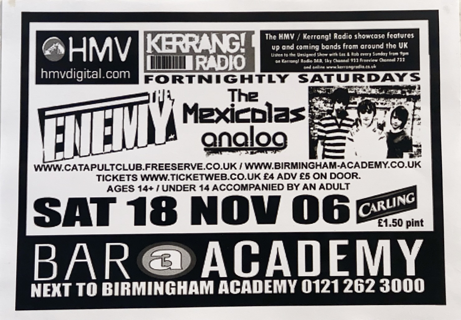 Flyer The Enemy The Mexicolas Analog Bar Academy Birmingham November 2006 Back to results Marc14 April 2026Arthur Tapp - Catapult Club flyer_18-11-2006_theenemy_baracademy_birmingham_arthurtapp Download TitleFlyer The Enemy The Mexicolas Analog Bar Academy Birmingham November 2006DescriptionCatapult Club present a night of live music at Birmingham's Bar Academy with The Enemy live on stage and The Mexicolas and Analog in support on 18th November 2006.Band/Performer/EventAnalog | The Enemy | The MexicolasDate18 November 2011VenueBar Academy BirminghamGenreRockSourceArthur Tapp - Catapult Club Share this item Previous itemFlyer Catapult Club 15th Anniversary King Adora Carling Academy 2 Birmingham Next itemFlyer Vinny Peculiar Andy Rourke Mike Joyce The Smiths Thirdfloorcalm Jug of Ale Birmingham