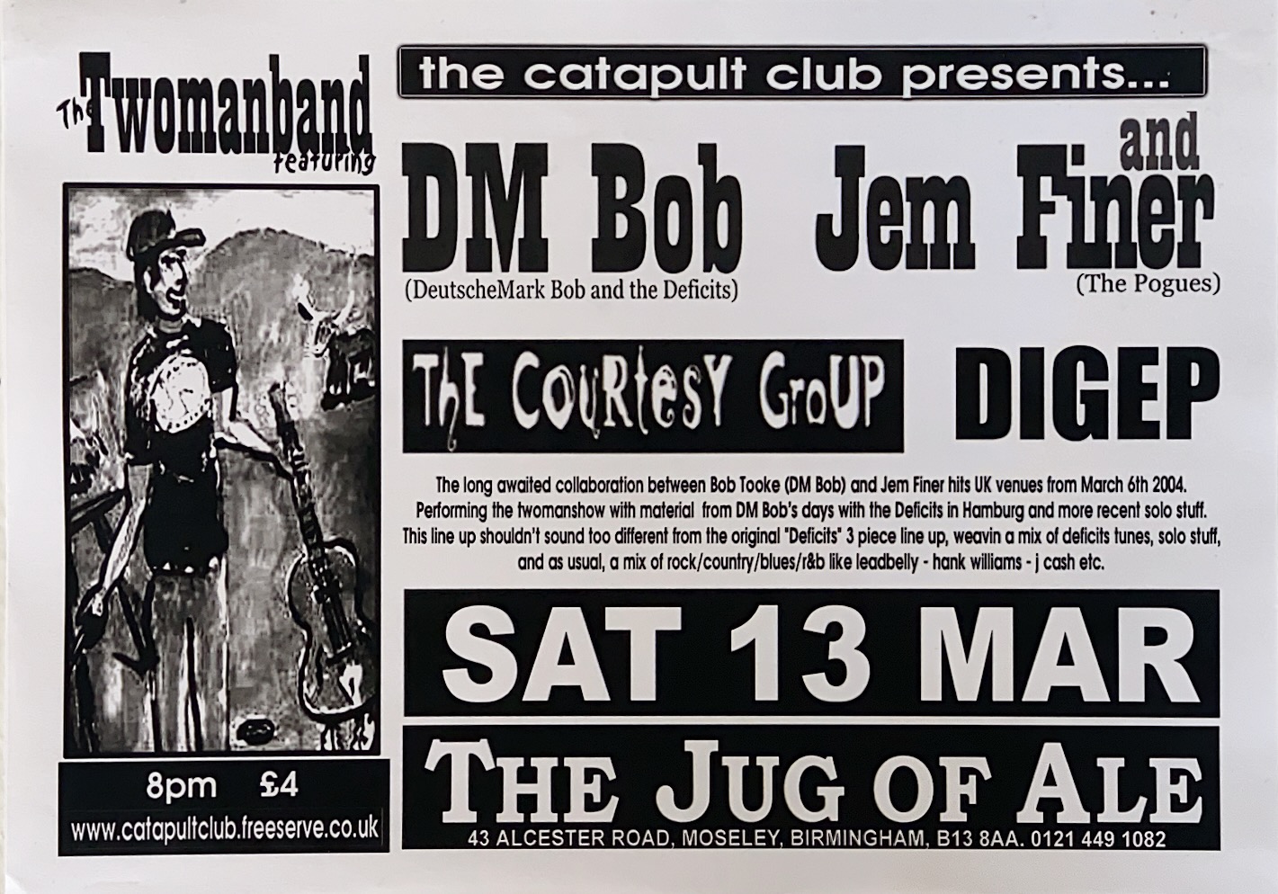 Flyer The Two Man Band Jug of Ale Birmingham Back to results Marc14 April 2026Arthur Tapp - Catapult Club flyer_13-03_thetwomanband_jugofale_birmingham_arthurtapp Download TitleFlyer The Two Man Band Jug of Ale BirminghamDescriptionCatapult Club present another night of live music at the Jug of Ale in Moseley with The Twomanband featuring DM Bob and the Deficits, Jem Finer (The Pogues), The Courtesy Group and Digep.Band/Performer/EventDigep | Jem Finer (The Pogues) | The Courtesy Group | The Twoman BandVenueThe Jug of Ale - MoseleyGenreRockSourceArthur Tapp - Catapult Club Share this item Previous itemFlyer Alaska Grandscope Silversuit Murdoch Carling Academy Birmingham May 2003 Next itemFlyer Scorpio Rising Tanglefoot Jug of Ale Birmingham
