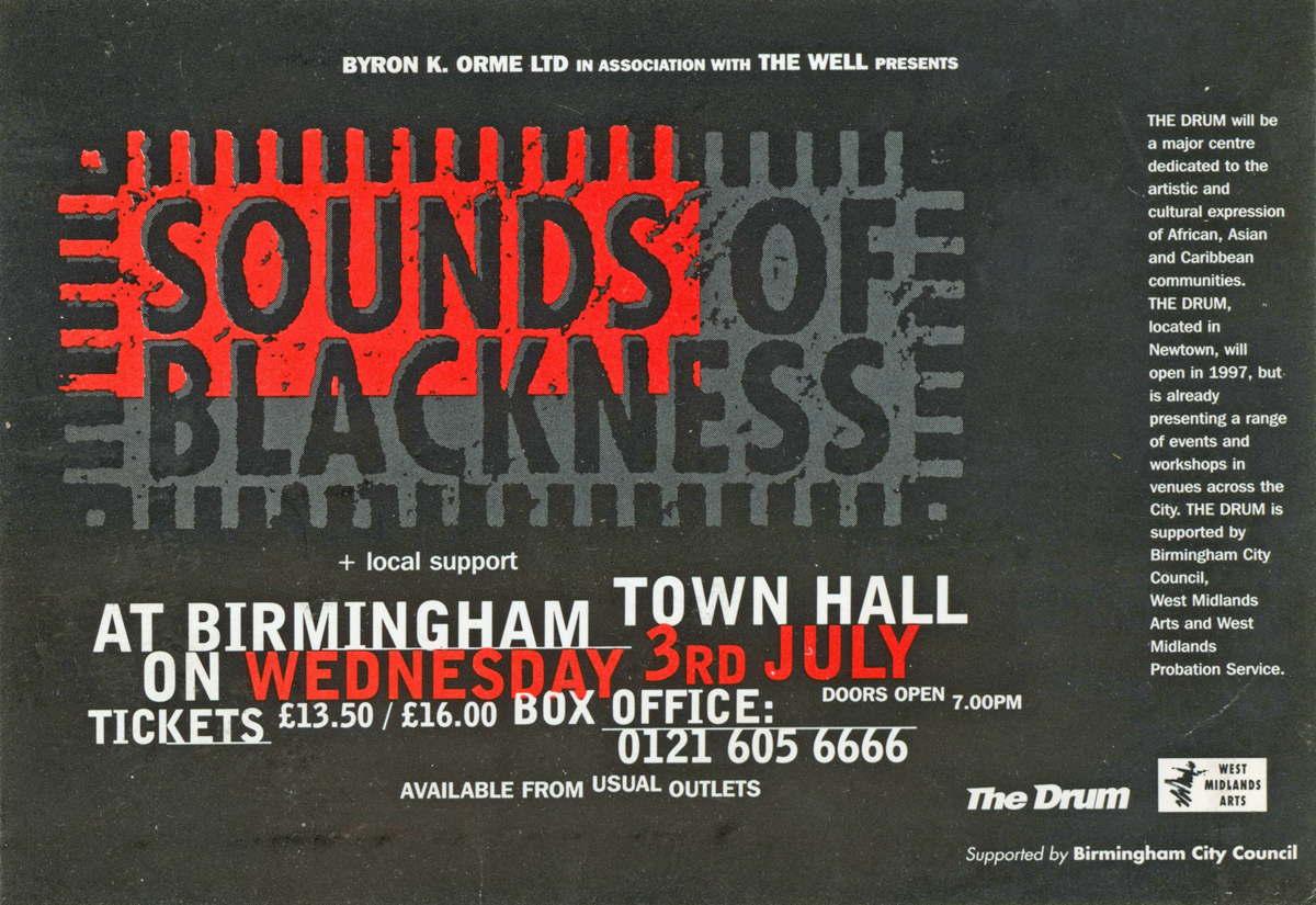 Flyer The Well Sounds of Blackness Town Hall Birmingham July 1996 Back to results Marc8 January 2026Beresford Dawkins flyer_03-07-1996_thewell_soundsofblackness_townhall_birmingham_beresforddawkins Download TitleFlyer The Well Sounds of Blackness Town Hall Birmingham July 1996DescriptionFlyer for the Sounds of Blackness in association with the Drum at Town Hall Birmingham on 3rd July 1996Band/Performer/EventThe Well SingersDate3 July 1996VenueBirmingham Town HallGenreGospelSourceBeresford Dawkins Share this item Previous itemFree Next itemPoster The Well 3rd Anniversary Show Library Theatre Birmingham April 1996
