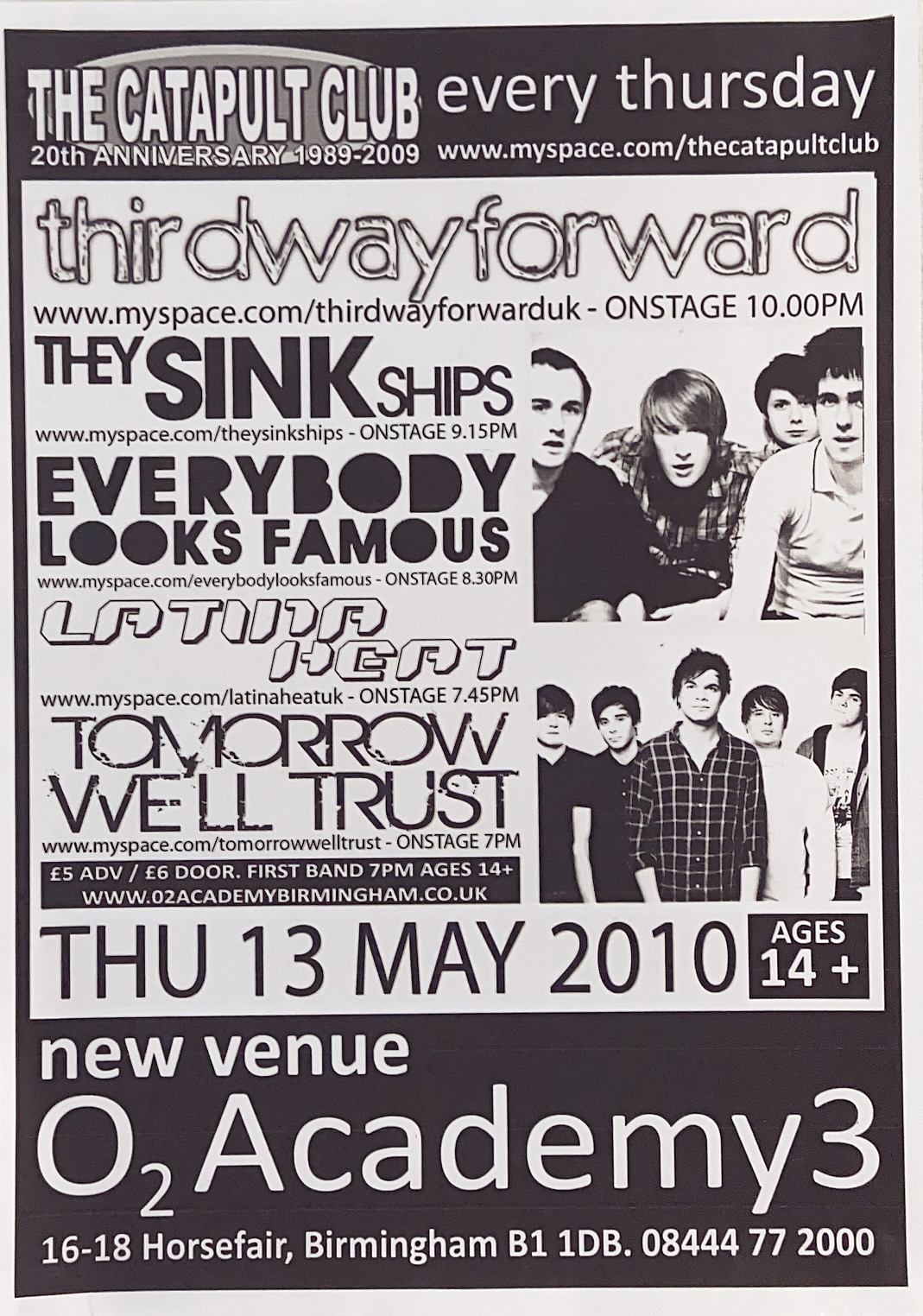 Flyer Third Way Forward o2 Academy 3 Birmingham May 2010 Back to results Marc14 April 2026Arthur Tapp - Catapult Club flyer_13-05-2010_thirdwayforward_o2academy3_birmingham_arthurtapp Download TitleFlyer Third Way Forward o2 Academy 3 Birmingham May 2010DescriptionCatapult Club presents Third Way Forward live on stage at Academy 3 in Birmingham with They Sink Ships, Everybody Looks Famous, Latina Heat and Tomorrow We'll Trust in support.Band/Performer/EventEverybody Looks Famous | Latina Heat | They Sink Ships | Third Way Forward | Tomorrow We'll TrustDate13 May 2010VenueAcademy 3 BirminghamGenreRockSourceArthur Tapp - Catapult Club Share this item Previous itemFlyer My Own Agenda Firelight Dutch Cousin Little Wing HMV Institute Birmingham Jan 2011 Next itemFlyer Jason Ensa and the Lobsters of Freedom Liner Burnside Jug of Ale Birmingham