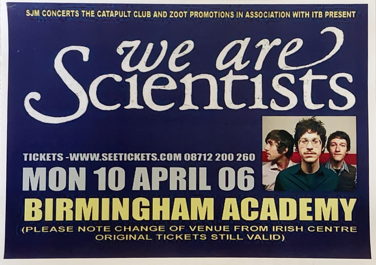 Flyer We are Scientists Birmingham Academy April 2006 Back to results Marc13 April 2026Arthur Tapp - Catapult Club flyer_10-04-2006_wearescientists_birminghamacademy_arthurtapp Download TitleFlyer We are Scientists Birmingham Academy April 2006DescriptionFlyer for New York Indie rock band We are Scientists playing live at the Academy Birmingham on 10th April 2006.Band/Performer/EventWe are ScientistsDate10 April 2006VenueThe Carling AcademyGenreIndie RockSourceArthur Tapp - Catapult Club Share this item Previous itemFlyer Stereogram Sunstone Jackpot Jug of Ale Birmingham Next itemFlyer Ella Guru Jug of Ale Birmingham