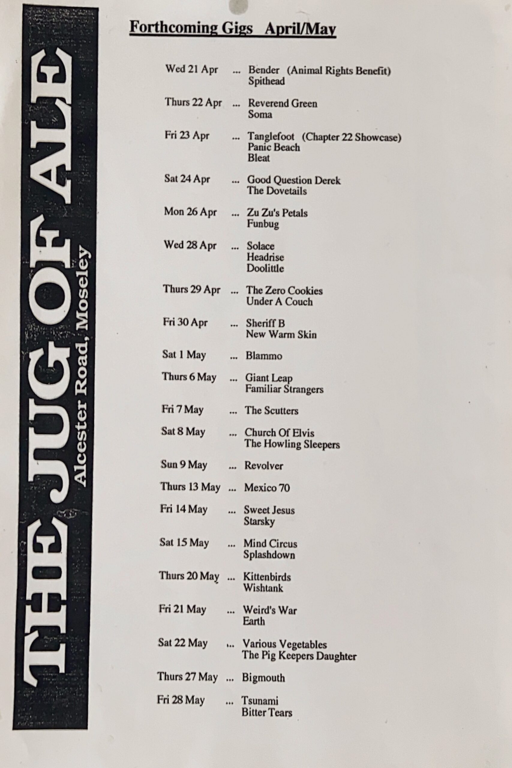 Gig listings April – May Catapult Club Jug of Ale Moseley Back to results Marc16 April 2026Arthur Tapp - Catapult Club listings_apr-may_catapultclub_jugofale_arthurtapp Download TitleGig listings April - May Catapult Club Jug of Ale MoseleyDescriptionCatapult Club present more gig listings from April - May sometime in the 1990s at the Jug of Ale Moseley. Bands include Tanglefoot, Church of Elvis, Delta and more...VenueThe Jug of Ale - MoseleyGenreRockSourceArthur Tapp - Catapult Club Share this item Previous itemGig listings April Catapult Club Jug of Ale Moseley Next itemGig listings August 1997 Catapult Club Jug of Ale Moseley