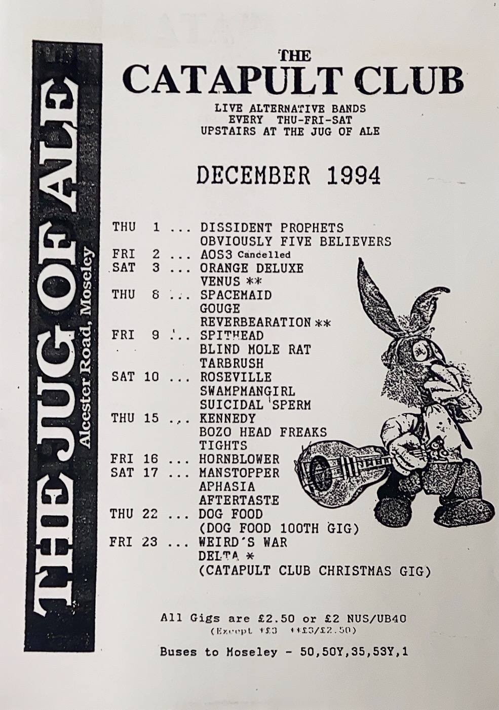 Gig listings December 1994 Catapult Club Jug of Ale Birmingham Back to results Marc16 April 2026Arthur Tapp - Catapult Club listings_dec-1994_catapultclub_jugofale_arthurtapp Download TitleGig listings December 1994 Catapult Club Jug of Ale BirminghamDescriptionPoster for Catapult Club's gig listings at the Jug of Ale in Moseley from December 1994. This months bands included Kennedy, Hornblower, Orange Deluxe and Dissident Prophets.VenueThe Jug of Ale - MoseleyGenreAlternative RockSourceArthur Tapp - Catapult Club Share this item Previous itemGig listings January – February 1995 Catapult Club Jug of Ale Moseley Next itemGig listings December 1997 Catapult Club Jug of Ale Moseley