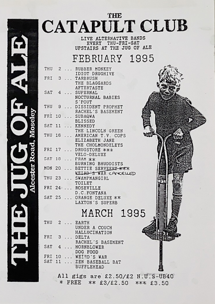Catapult Club presents gig listings for February and March 1995 at the Jug of Ale in Moseley. Live alternative music including Rachel's Basement, Subaqwa, Dog Food and Bufflehead.