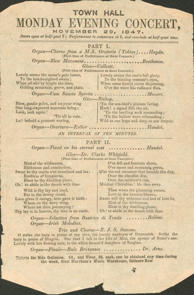 Monday Evening Concert Poster 1847 Back to results Simren Johal7 December 2025Birmingham Library Collection poster_29-11-1847_mondayeveningconcert_townhall_birminghamlibrarycollection Download TitleMonday Evening Concert Poster 1847DescriptionMonday Evening Concert Poster 1847Band/Performer/EventMonday Evening ConcertDate29 November 1847VenueBirmingham Town HallGenreclassicalSourceBirmingham Library Collection Share this item Previous itemMonty Sunshine Jazz Band Poster 1961 Next itemElton John poster