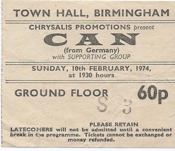 CAN Birmingham Town Hall – Ground Floor – February1974 Back to results Maggie Connaire30 October 2025Ron Brinsdon ticket_10-02-1974_can_townhall_ronbrinsdon Download Gig NameCAN Birmingham Town Hall - Ground Floor - February1974DescriptionTicket to see German experimental rockers CAN live in concert at Town Hall Birmingham on the Ground Floor on 10th February 1974.Band/Performer/EventCanDate10 February 1974VenueBirmingham Town HallSourceRon Brinsdon Share this item Previous itemStatus Quo Birmingham Town Hall October 1973 Next itemFrank Zappa – Mothers of Invention – Birmingham Town Hall Sept 1973