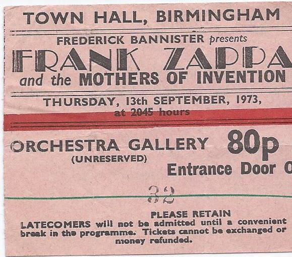 Ticket to see Frank Zappa and his experimental rock band The Mothers of Invention live in concert in the Orchestra Gallery at Birmingham Town Hall on 13th September 1973.