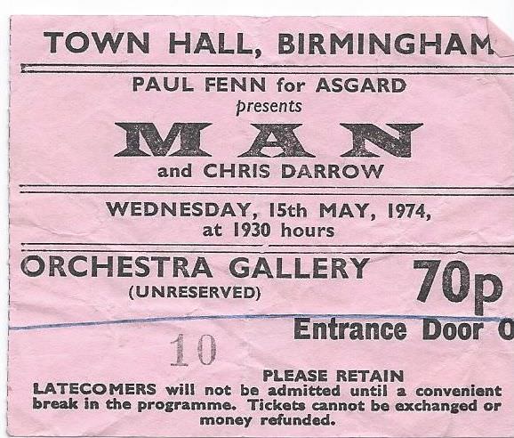 Man Birmingham Town Hall with Chris Darrow May 1974 Back to results Maggie Connaire31 October 2025Ron Brinsdon ticket_15-05-1974_man_townhall_ronbrinsdon Download Gig NameMan Birmingham Town Hall with Chris Darrow May 1974DescriptionTicket to see prog-rockers MAN and Chris Darrow live in concert at Birmingham Town Hall on 15th May 1974. Ticket for the Orchestra Gallery (unreserved) cost 70 pence.Band/Performer/EventMAN (The Manband)Date15 May 1974VenueBirmingham Town HallSourceRon Brinsdon Share this item Previous itemFrank Zappa – Mothers of Invention – Birmingham Town Hall Sept 1973 Next itemHatfield and The North Birmingham Town Hall Ground Floor 1974