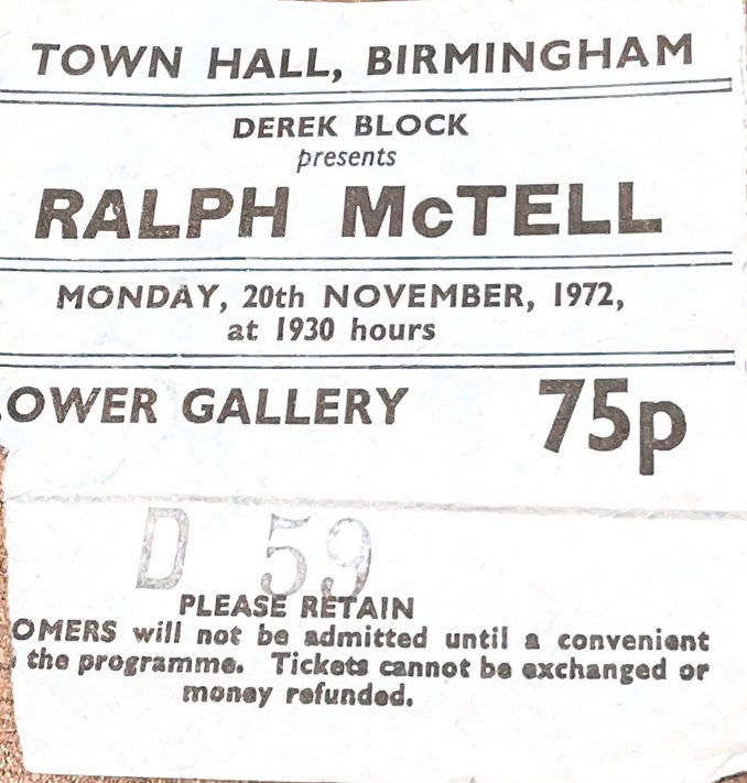 Ralph Mctell Birmingham Town Hall Lower Gallery November 1972 Back to results Marc24 October 2025David Warner ticket_20-11-1972_ralphmctell_townhall_davidwarner Download Gig NameRalph Mctell Birmingham Town Hall Lower Gallery November 1972DescriptionTicket to see Folk musician Ralph Mctell live in concert at Birmingham Town Hall on 20th November 1972Band/Performer/EventRalph MctellDate20 November 1972VenueBirmingham Town HallGenreFolkSourceDavid Warner Share this item Previous itemTubular Bells for Two Birmingham Town Hall May 2019 Next itemRichard Thompson – The Electric Tour – Birmingham Town Hall February 2013