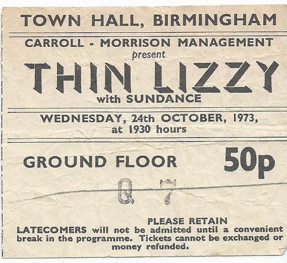 Thin Lizzy with Sundance – Birmingham Town Hall October 1973 Back to results Maggie Connaire31 October 2025Ron Brinsdon ticket_24-10-1973_thinlizzy_townhall_ronbrinsdon Download Gig NameThin Lizzy with Sundance - Birmingham Town Hall October 1973DescriptionTicket to see Dublin hard blues rock band Thin Lizzy live in concert at Birmingham Town Hall on 24th October 1973. Ground floor ticket cost 50 pence.Band/Performer/EventSundance | Thin LizzyDate24 October 1973VenueBirmingham Town HallSourceRon Brinsdon Share this item Previous itemHatfield and The North Birmingham Town Hall Ground Floor 1974 Next itemMan Birmingham Town Hall 1973 Ground Floor