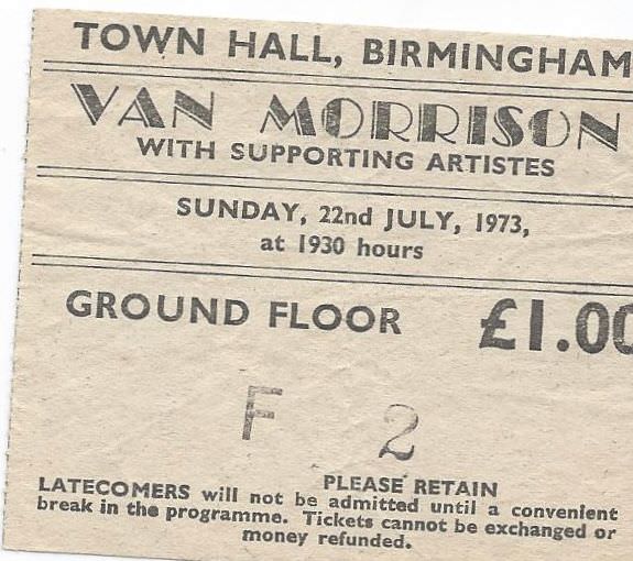 Van Morrison Birmingham Town Hall July 1973 Back to results Maggie Connaire30 October 2025Ron Brinsdon ticket_22-07-1973_vanmorrison_townhall_ronbrinsdon Download Gig NameVan Morrison Birmingham Town Hall July 1973DescriptionTicket to see Northern Irish blue-eyed-soul singer Van Morrison live in concert at Birmingham Town Hall on 22nd July 1973. Ground Floor ticket cost £1.00.Band/Performer/EventVan MorrisonDate22 July 1973VenueBirmingham Town HallSourceRon Brinsdon Share this item Previous itemDavid Bowie – Ziggy Stardust – Birmingham Town Hall June 1973 – 18.00 Next itemAlex Harvey Band Birmingham Town Hall October 1974